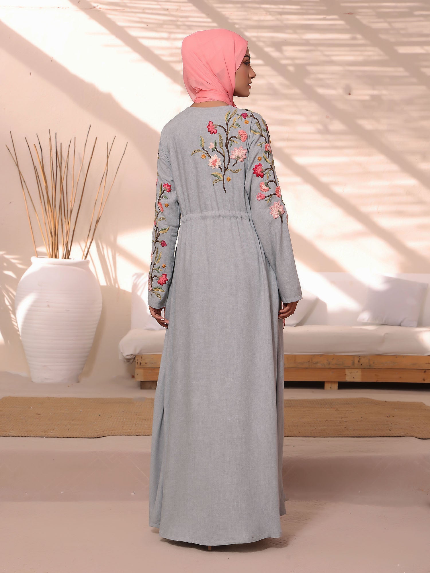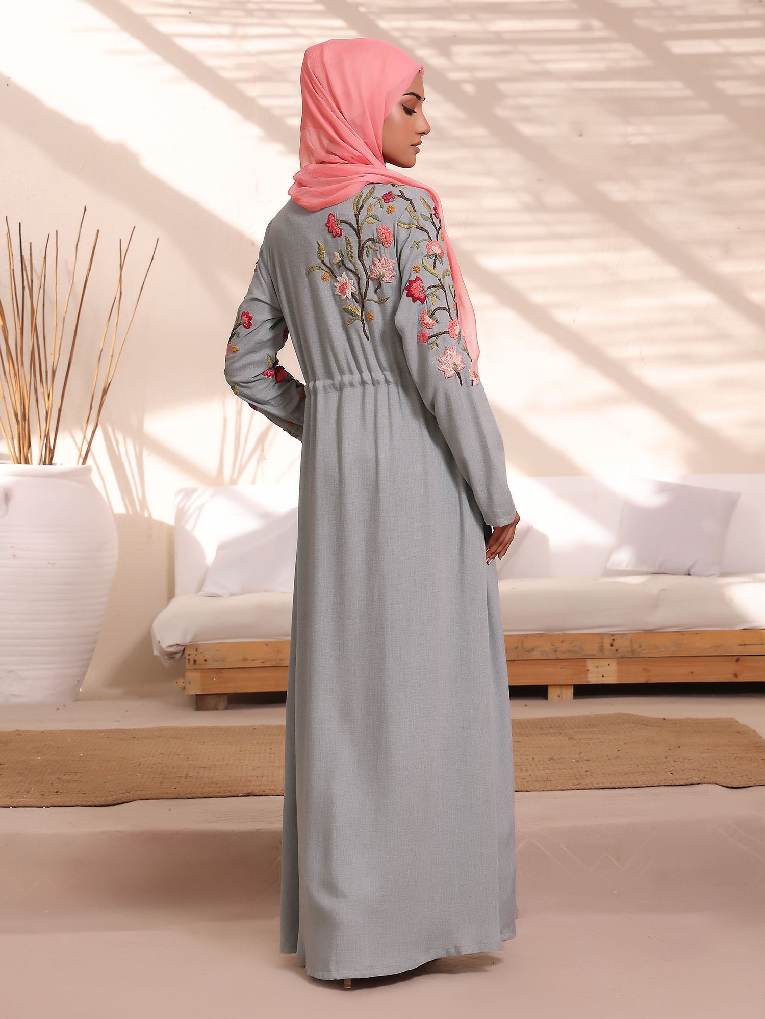 "Baghicha-e-Shaistagi"Modestly Design Occasions Wear Kimono With Rich Exotic Floral Chunky Embroidery At Front & Back Bodice, Shoulder & Sleeves. Tussles At Front Waist For More Structured Fit. Side Pockets Provided To Keep Your Belongings Safe. Enjoy Your Occasion With This Premium Embroidered Kimono. Fabric: Plain Weave Type:WovenCare:Do Not Machine Wash, Do Not...
